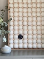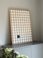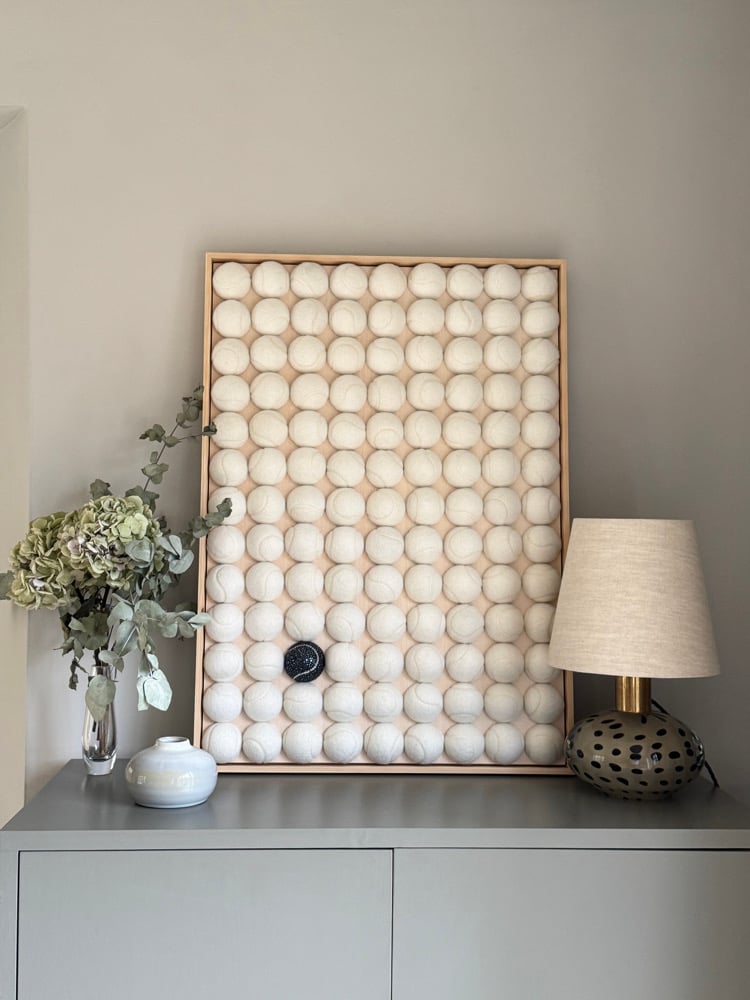 This striking piece features 117 tennis ball halves arranged in a perfect orderly form securely placed on a wooden panel. One ball in particular breaks the pattern by reminding you to stand out.